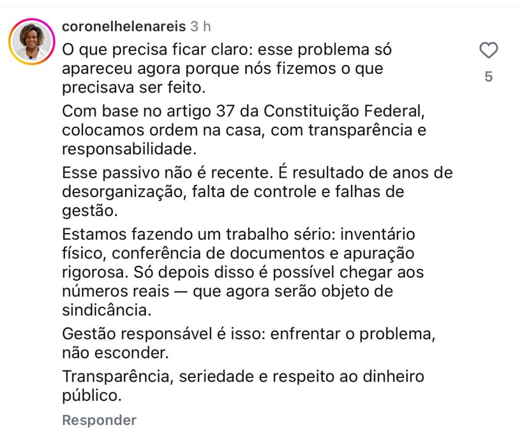 Coronel Helena se manifestou nas redes sociais em comentários de veículos que publicaram sobre o novo escândalo e esclareceu que com base no artigo 37 da Constituição Federal, ela colocou a casa em ordem, com transparência e responsabilidade. Procurada pela nossa equipe, a ex-secretária não respondeu a tempo da matéria ir ao ar.